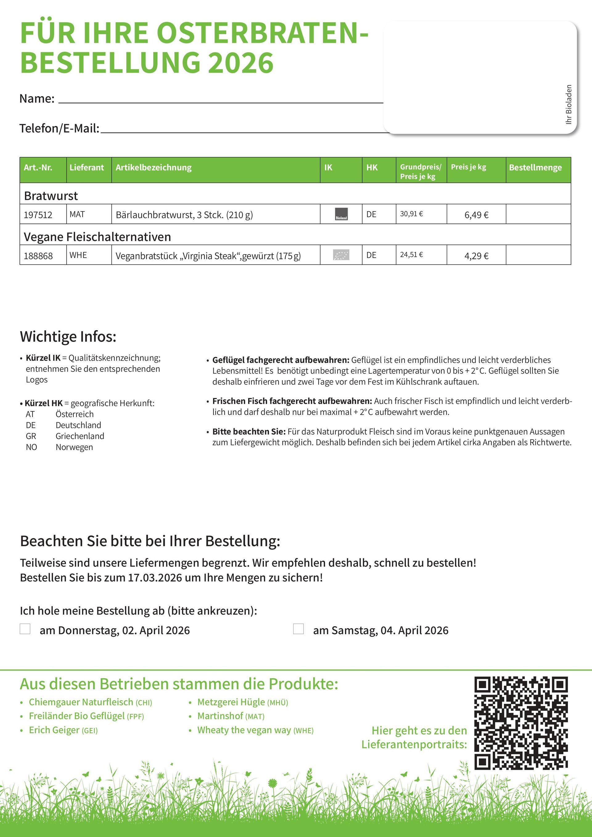 Wir bitten um Bestellung bis spätestens 28.03.2026 um 14 Uhr.